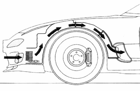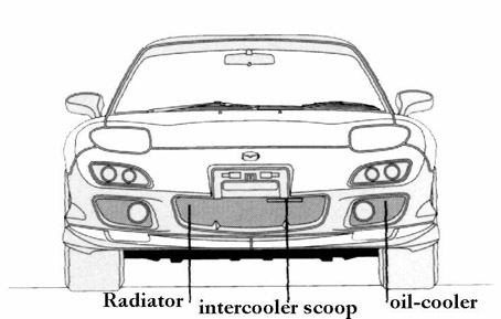 The third-generation RX-7 had come off Mazda's rigorous development test programs on the bench and on the demanding Global Road Circuit section of the Miyoshi Proving Ground with flying colors. Yet, there was one arduous test left undone. When the car was taken to a race track near Tokyo known for its tight turns requiring short bursts of speed followed by fierce deceleration, the pride of Mazda's rotary rocket team quickly cooked its powerplant when pushed to the limit. Subsequent investigation revealed that air temperature at the entry area had risen as high as 50 C (122 F). Fresh air for the engine's consumption was taken from the single intake that also fed to the air-to-air intercooler. On wide-open driving, air flow reversed its course from the intercooler and went straight into the engine's intake. The intercooler was acting as an inter-heater! In the updated RX-7 with a designed fascia, fresh air is taken through a separate, dedicated duct guided by a newly installed air-guide. Air temperature at the engine's intake entry area has been halved to about 25 C ( 77 F), which adds about 7 kW (10bhp) to the output.