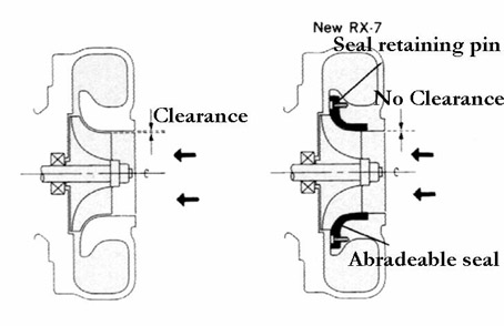 The turbocharger, two of which are used in the sequential setup, is a new Hitachi instrument with an abradable compressor sealing and an "ultra-high-flow" turbine design. The abradable compressor housing sealing has been in U.S. markets, Toyota being the first to use it in the MR-2 sports car, some years ago. It was one of the more promising items in the menu the Mazda's rotary engine designers had prepared a few years ago to get more power out of the 13B-REW, but, according to Yamamoto, the company was in a dire financial state, and the design team could not dare ask for the expensive turbocharger. The Toyota unit had plastic layer hot-sprayed onto the housing's surface, a methodology hardly suitable for large scale production, therefore costly.
